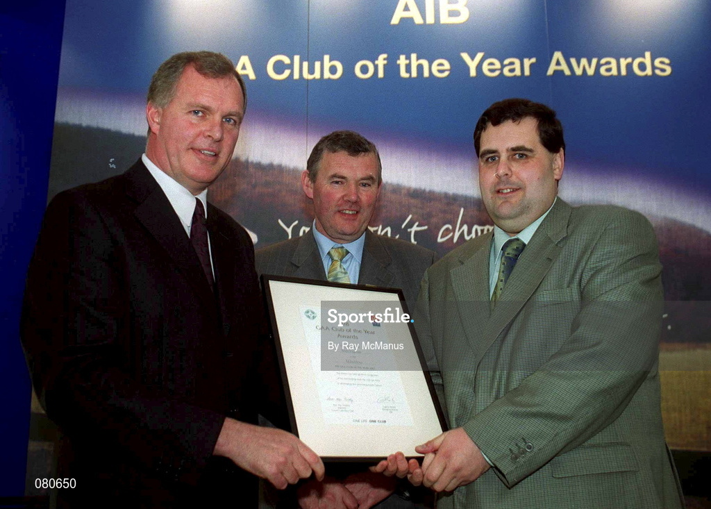 4 February 2002; Pictured at the AIB GAA Club of the Year Awards 2001 in Croke Park are Eugene Sheehy, Managing Director AIB, President of the GAA Sean McCague, Eamon O'Keefe of Baltinglass GAA Club who won the Wicklow Club of the Year Award at Croke Park in Dublin. Photo by Ray McManus/Sportsfile