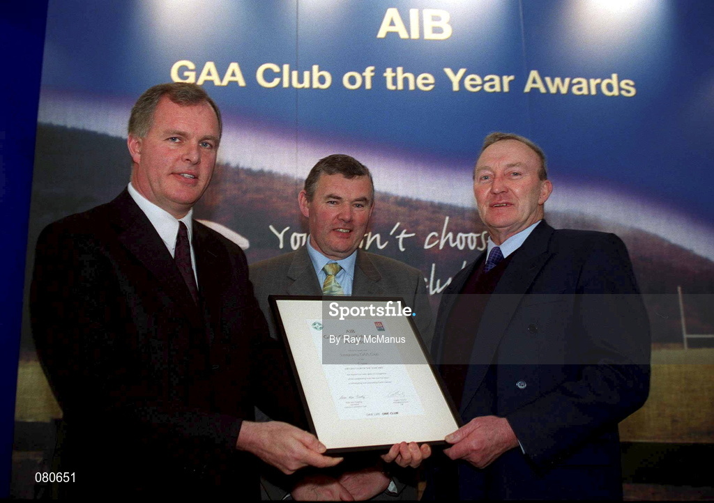 4 February 2002; Pictured at the AIB GAA Club of the Year Awards 2001 in Croke Park are Eugene Sheehy, Managing Director AIB, President of the GAA Sean McCague, Paudie Halpin of Lisseycasey GAA Club who won the Clare Club of the Year Award at Croke Park in Dublin. Photo by Ray McManus/Sportsfile
