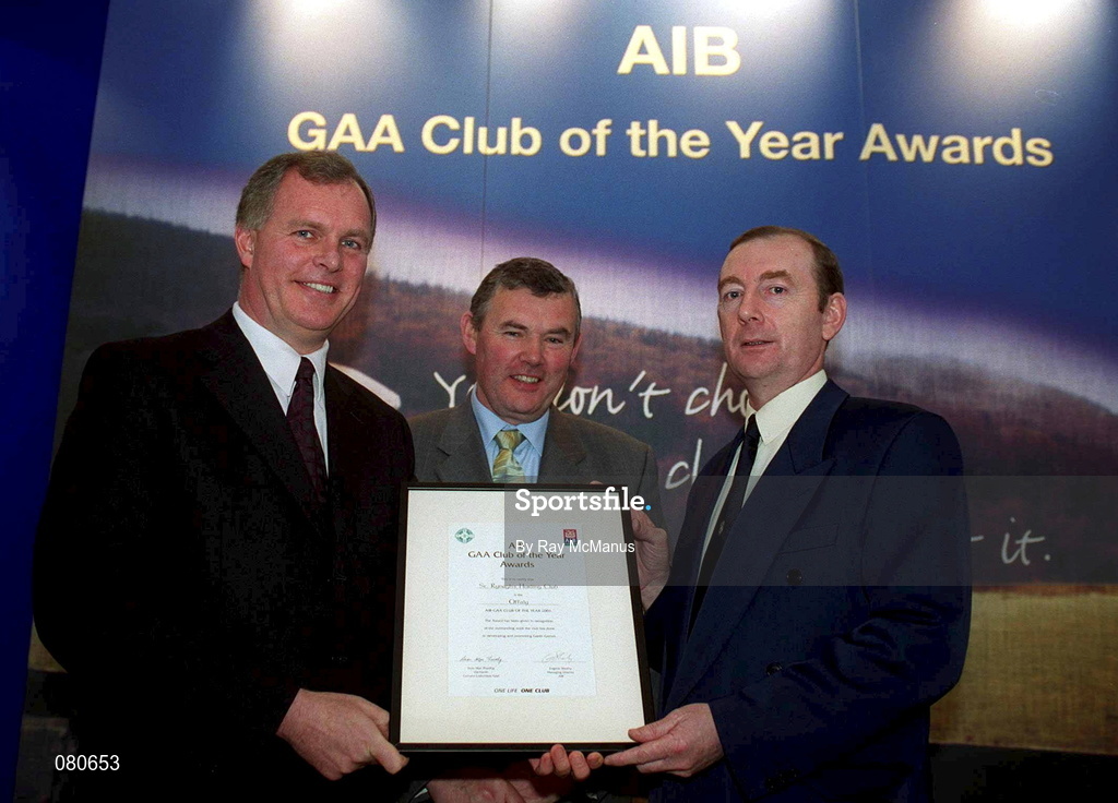 4 February 2002; Pictured at the AIB GAA Club of the Year Awards 2001 in Croke Park are Eugene Sheehy, Managing Director AIB, President of the GAA Sean McCague, Paddy Scales of St. Ryanagh's GAA Club who won the Offaly Club of the Year Award at Croke Park in Dublin. Photo by Ray McManus/Sportsfile