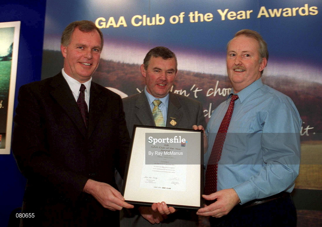 4 February 2002; Pictured at the AIB GAA Club of the Year Awards 2001 in Croke Park are Eugene Sheehy, Managing Director AIB, President of the GAA Sean McCague, Thomas Healy of Adare GAA club who won the Limerick Club of the Year Award at Croke Park in Dublin. Photo by Ray McManus/Sportsfile