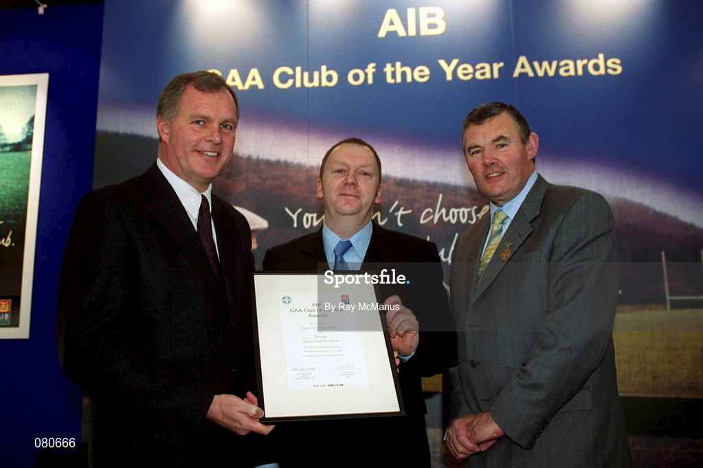 4 February 2002; Pictured at the AIB GAA Club of the Year Awards 2001 in Croke Park are Eugene Sheehy, Managing Director AIB, Sean McCague, President of the GAA, Joe French of Gort na Mona who won the Antrim Club of the Year Award, at Croke Park in Dublin. Photo by Ray McManus/Sportsfile