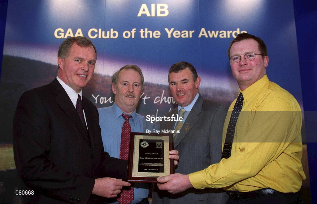 4 February 2002; Pictured at the AIB GAA Club of the Year Awards 2001 in Croke Park is Neil Coakley of AIB, Thomas Healy and Kevin O'Mahony from Adare GAA Club who were winners of the Munster AIB GAA Club of the Year award & the Limerick County Award with GAA President Sean McCague at Croke Park in Dublin. Photo by Ray McManus/Sportsfile