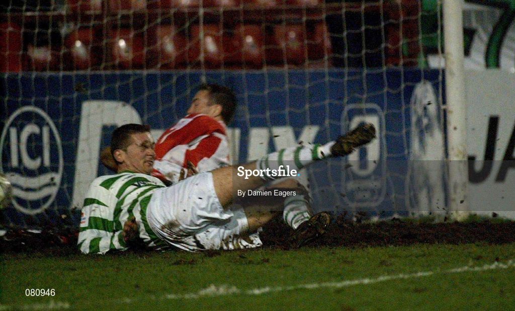 8 February 2002; Billy Woods of Shamrock Rovers slides in to score his side's first goal during the FAI Carlsberg Cup Quarter-Final match between Shamrock Rovers and Sligo Rovers at Tolka Park in Dublin. Photo by Damien Eagers/Sportsfile