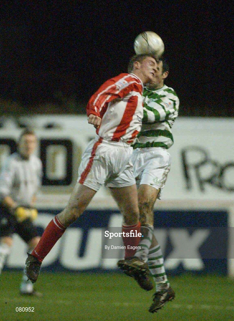 8 February 2002; Sean Flannery of Sligo Rovers in action against Terry Palmer of Shamrock Rovers during the FAI Carlsberg Cup Quarter-Final match between Shamrock Rovers and Sligo Rovers at Tolka Park in Dublin. Photo by Damien Eagers/Sportsfile