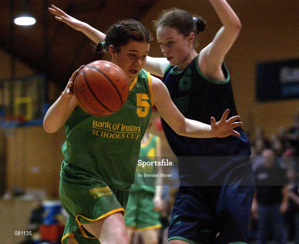 12 February 2002; Andrina Carmody of Presentation Listowel in action against Emma Kilgallon of Ursuline College during the Bank of Ireland Schools Cup U16 "A" Girls Final match between Ursuline College, Sligo, and Presentation Listowel, Kerry, at the ESB Arena in Tallaght, Dublin. Photo by Brendan Moran/Sportsfile