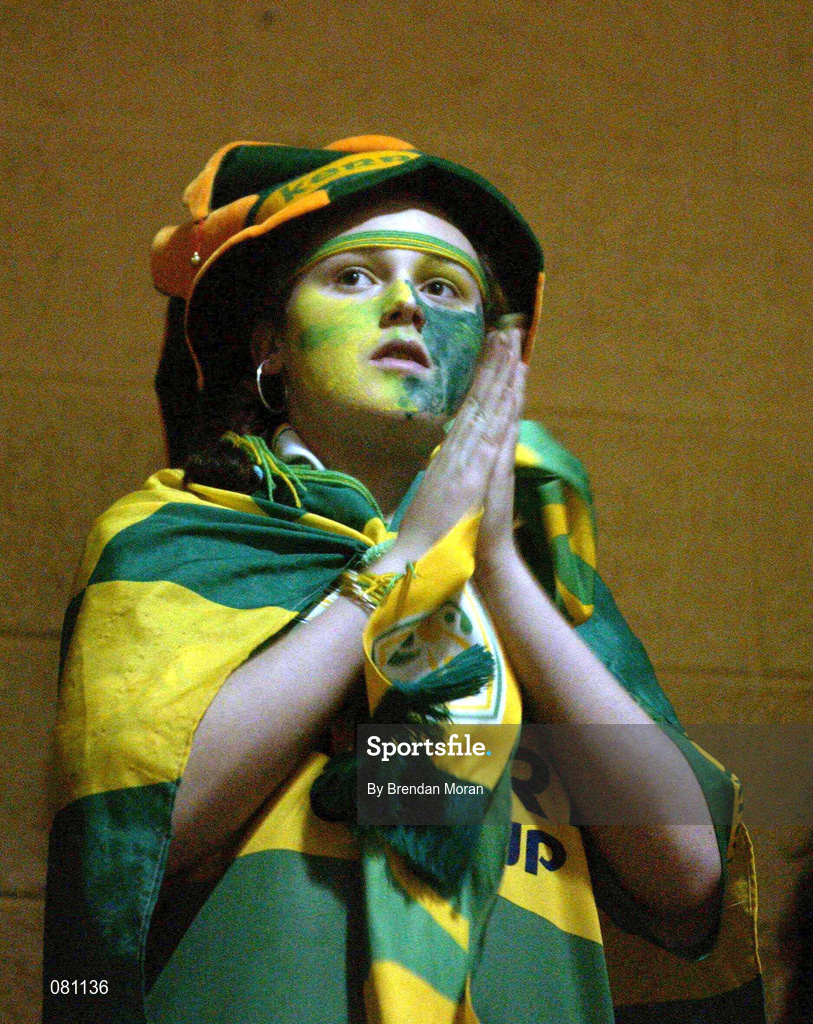 12 February 2002; A Presentation Listowel fan watches her side in action during the Bank of Ireland Schools Cup U16 "A" Girls Final match between Ursuline College, Sligo, and Presentation Listowel, Kerry, at the ESB Arena in Tallaght, Dublin. Photo by Brendan Moran/Sportsfile