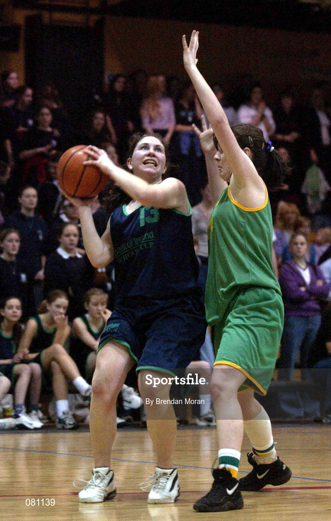 12 February 2002; Karen O'Boyle of Ursuline College in action against Caroline Walsh of Presentation Listowel during the Bank of Ireland Schools Cup U16 "A" Girls Final match between Ursuline College, Sligo, and Presentation Listowel, Kerry, at the ESB Arena in Tallaght, Dublin. Photo by Brendan Moran/Sportsfile