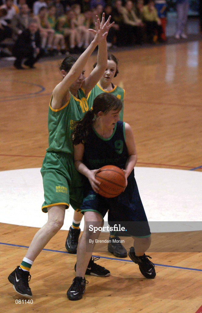 12 February 2002; Lorraine Dolan of Ursuline College in action against Susan O'Carrol of Presentation Listowel during the Bank of Ireland Schools Cup U16 "A" Girls Final match between Ursuline College, Sligo, and Presentation Listowel, Kerry, at the ESB Arena in Tallaght, Dublin. Photo by Brendan Moran/Sportsfile