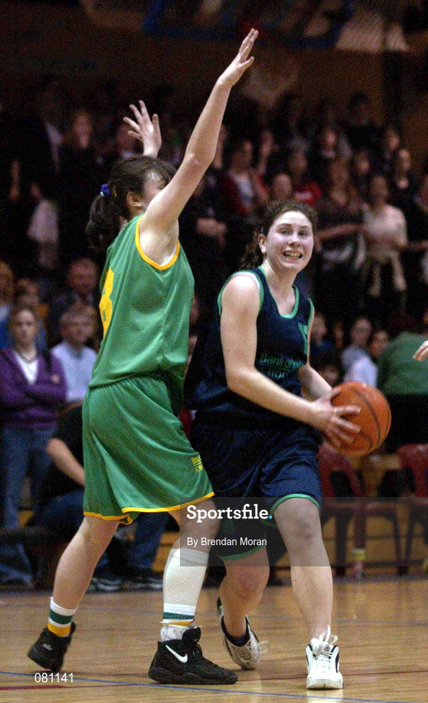 12 February 2002; Karen O'Boyle of Ursuline College in action against Caroline Walsh of Presentation Listowel during the Bank of Ireland Schools Cup U16 "A" Girls Final match between Ursuline College, Sligo, and Presentation Listowel, Kerry, at the ESB Arena in Tallaght, Dublin. Photo by Brendan Moran/Sportsfile
