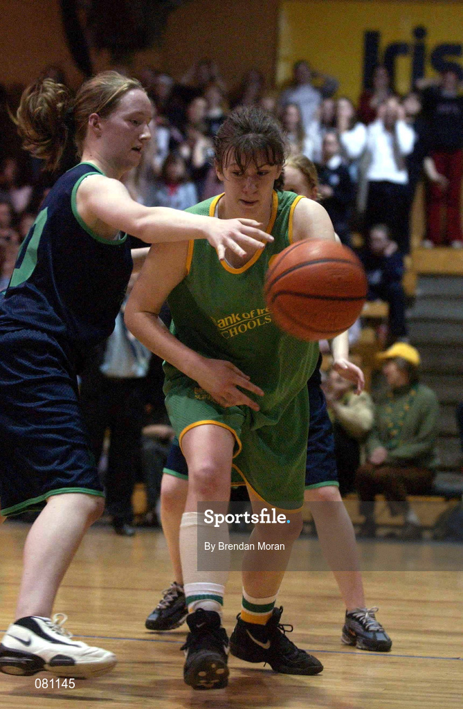 12 February 2002; Caroline Walsh of Presentation Listowel in action against Edel McGinley of Ursuline College during the Bank of Ireland Schools Cup U16 "A" Girls Final match between Ursuline College, Sligo, and Presentation Listowel, Kerry, at the ESB Arena in Tallaght, Dublin. Photo by Brendan Moran/Sportsfile