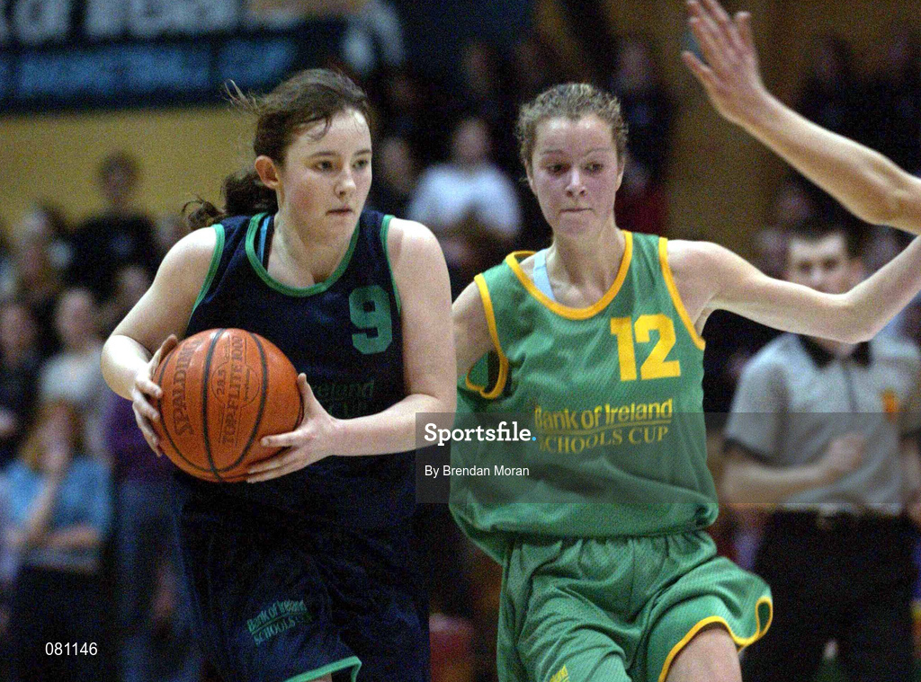 12 February 2002; Lorraine Dolan of Ursuline College in action against Edwina Buckley of Presentation Listowel during the Bank of Ireland Schools Cup U16 "A" Girls Final match between Ursuline College, Sligo, and Presentation Listowel, Kerry, at the ESB Arena in Tallaght, Dublin. Photo by Brendan Moran/Sportsfile