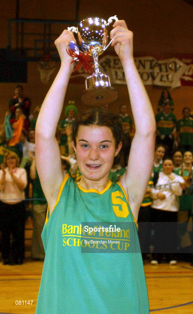 12 February 2002; Presentation Listowel captain Andrina Carmody celebrates with the cup following her side's victory of Ursuline College in the Bank of Ireland Schools Cup U16 "A" Girls Final match between Ursuline College, Sligo, and Presentation Listowel, Kerry, at the ESB Arena in Tallaght, Dublin. Photo by Brendan Moran/Sportsfile