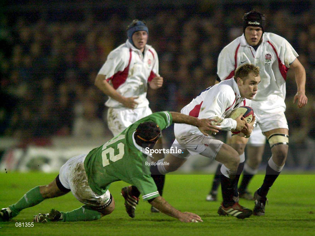 15 February 2002; Andy Goode of England A, breaks past Mike Mullins of Ireland A during the "A" Rugby International match between England and Ireland at Franklin Gardens in Northampton, England. Photo by Sportsfile