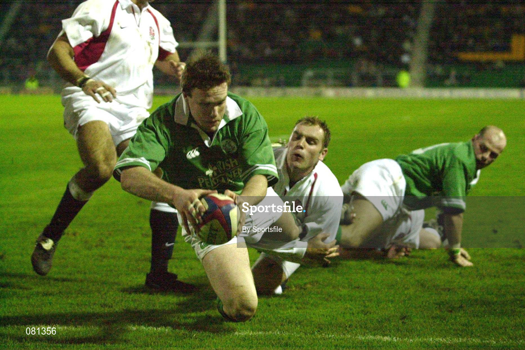 15 February 2002; John Kelly of Ireland A goes over for a try during the "A" Rugby International match between England and Ireland at Franklin Gardens in Northampton, England. Photo by Sportsfile