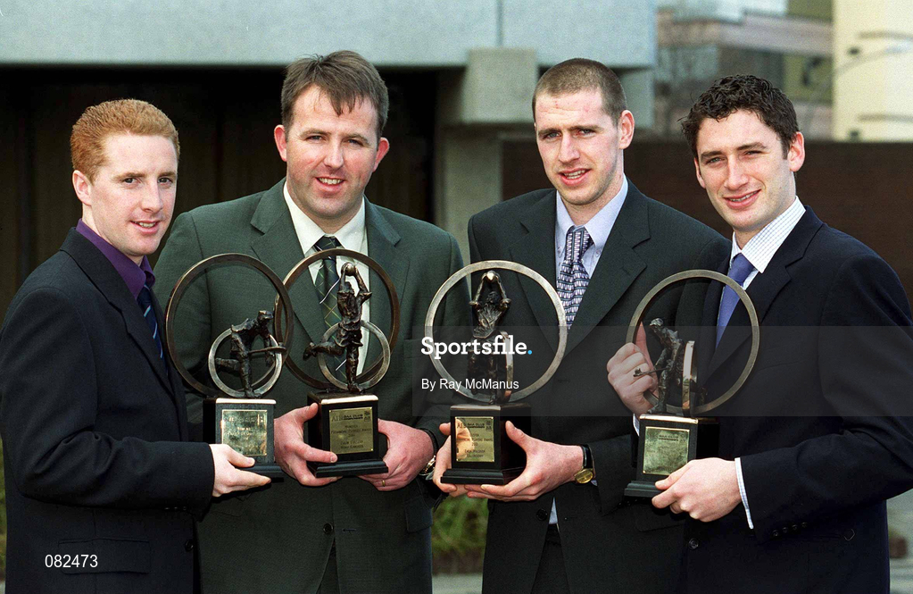 4 March 2002; AIB GAA Provincial Player of the Year Award winners, from left, Simon Whelahan of Birr, Leinster Hurling Winner, Colin Corkery of Nemo Rangers, Munster Football winner, Enda Muldoon of Ballinderry, Ulster Football winner, and Mark Kerins of Clarinbridge, Connacht Hurling winner, during the AIB GAA Provincial Player of the Year Awards 2001 at AIB Bankcentre in Ballsbridge, Dublin. All four winners will be in action in the AIB Club Finals on March 17th. Photo by Ray McManus/Sportsfile