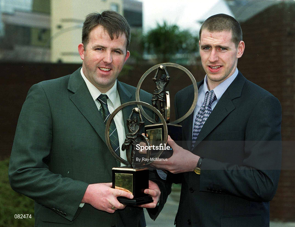 4 March 2002; AIB GAA Provincial Player of the Year Award winners Colin Corkery of Nemo Rangers, left, Munster Football winner, and Enda Muldoon of Ballinderry, Ulster Football winner, during the AIB GAA Provincial Player of the Year Awards 2001 at AIB Bankcentre in Ballsbridge, Dublin. Both players will meet in the AIB All-Ireland Football Club Final on March 17th. Photo by Ray McManus/Sportsfile