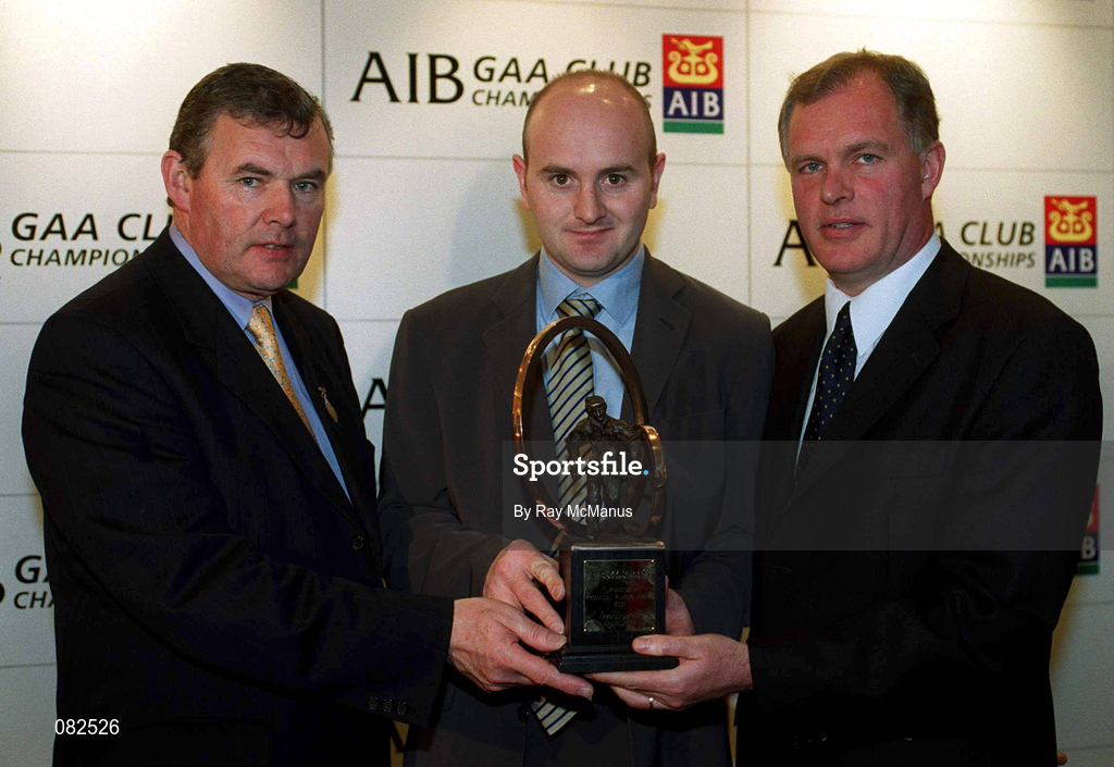 4 March 2002; Fergal Hartley of Ballygunner, Munster Hurling Award Winner, centre, with Uachtarán Chumann Lœthchleas Gael Sean McCague, left, and Managing Director of AIB Eugene Sheehy, during the AIB GAA Provincial Player of the Year Awards 2001 at AIB Bankcentre in Ballsbridge, Dublin. Photo by Ray McManus/Sportsfile