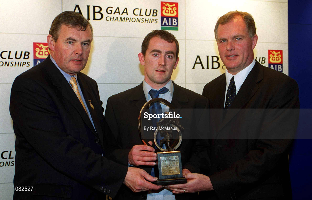 4 March 2002; Alistair Elliot of Dunloy, Ulster Hurling Award Winner, centre, with Uachtarán Chumann Lœthchleas Gael Sean McCague, left, and Managing Director of AIB Eugene Sheehy, during the AIB GAA Provincial Player of the Year Awards 2001 at AIB Bankcentre in Ballsbridge, Dublin. Photo by Ray McManus/Sportsfile