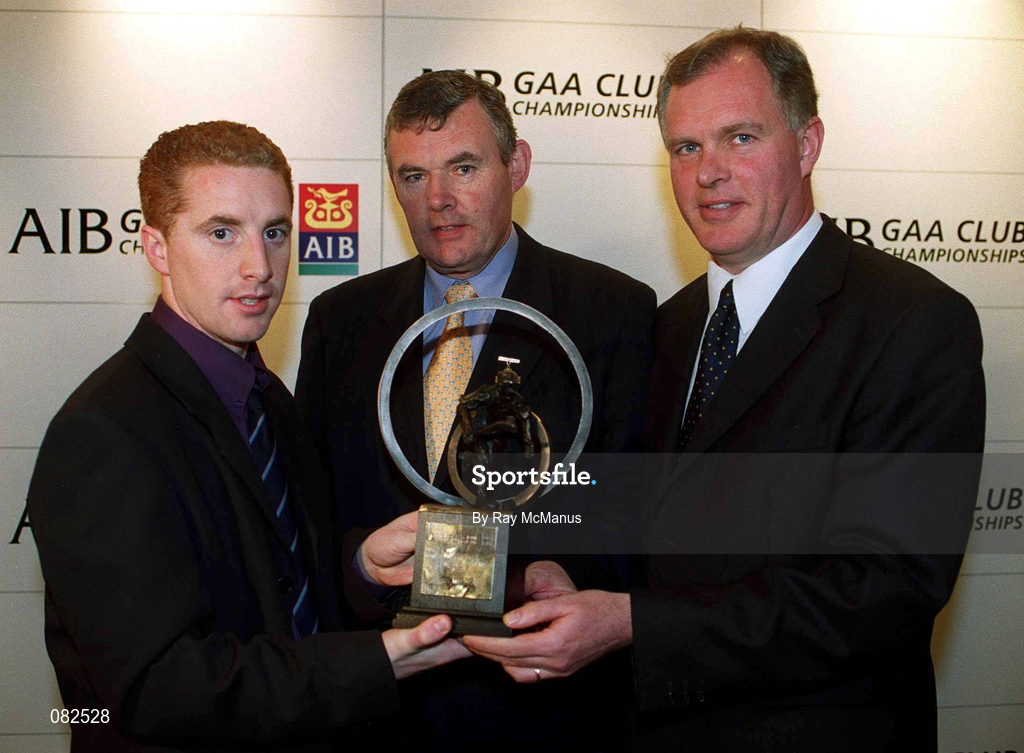 4 March 2002; Simon Whelahan of Birr, Leinster Hurling Award Winner, left, with Uachtarán Chumann Lœthchleas Gael Sean McCague, centre, and Managing Director of AIB Eugene Sheehy, during the AIB GAA Provincial Player of the Year Awards 2001 at AIB Bankcentre in Ballsbridge, Dublin. Photo by Ray McManus/Sportsfile