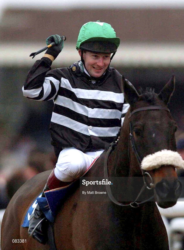14 March 2002; David Casey celebrates after winning the 130th Year of The Cheltenham Grand Annual Steeple Chase Challenge Cup on Fadoudal Du Cochet during Day Three of the Cheltenham Racing Festival at Prestbury Park in Cheltenham, England. Photo by Matt Browne/Sportsfile