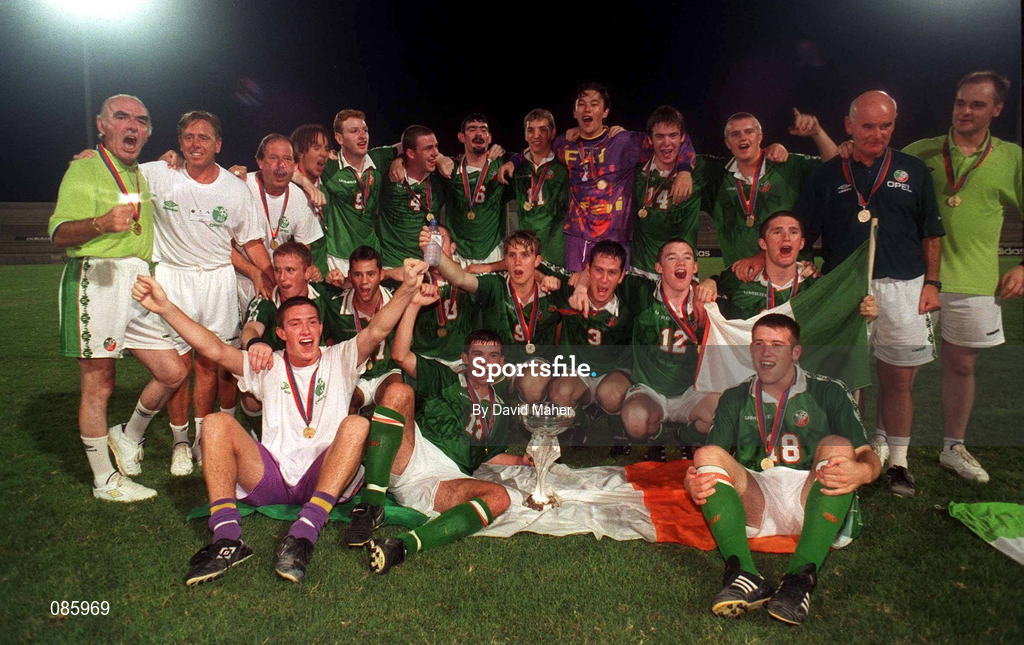 25 July 1998; Republic of Ireland players celebrate with the trophy following their side's victory during the UEFA European Under-18 Championship Final against Germany at GSZ Stadium in Larnaca, Cyprus. Photo by David Maher/Sportsfile