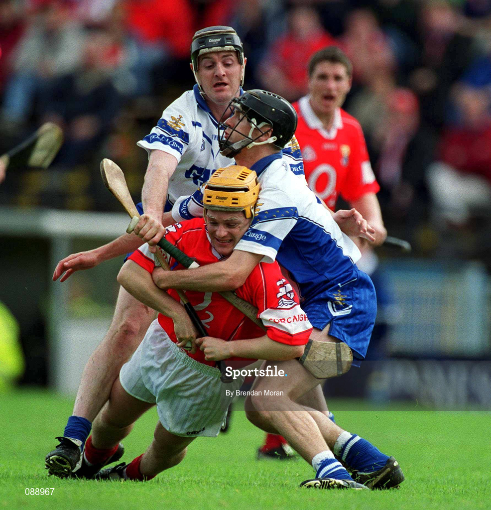 26 May 2002; Cork's Joe Deane is tackled by Waterford's James Murray, right, and Fergal Hartley during the Guinness Munster Senior Hurling Championship Semi-Final match between Waterford and Cork at Semple Stadium in Thurles, Tipperary. Photo by Brendan Moran/Sportsfile