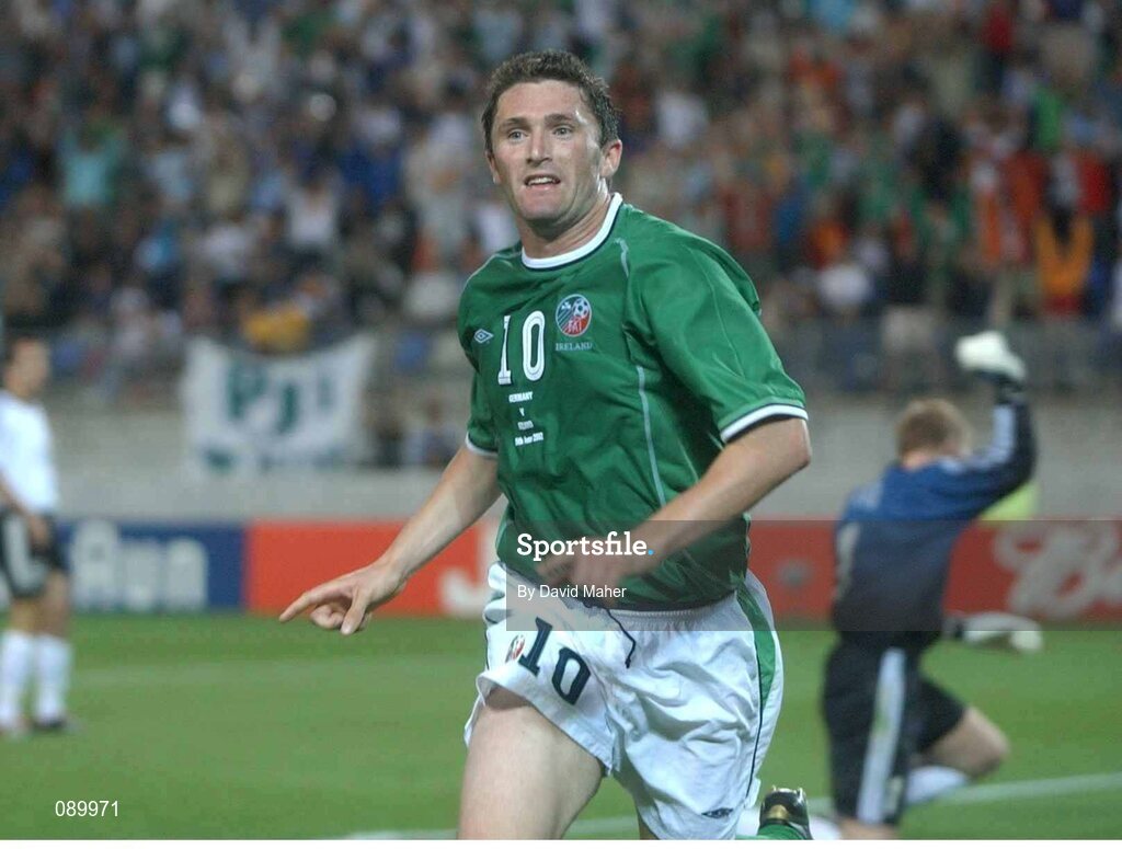 5 June 2002; Robbie Keane, Republic of Ireland, celebrates after scoring his equalising goal against Germany. FIFA World Cup Finals, Group E, Republic of Ireland v Germany, Ibaraki Stadium, Ibaraki, Japan. Picture credit: David Maher / SPORTSFILE