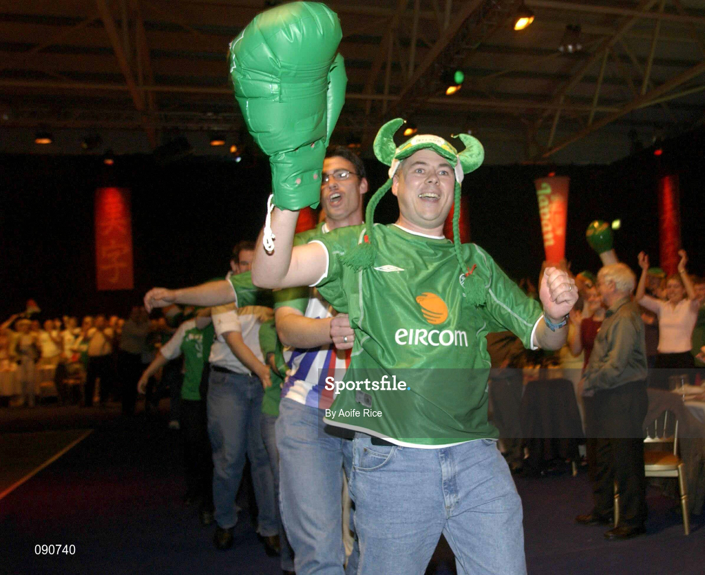 11 June 2002; Republic of Ireland supporters celebrate following their side's victory during the FIFA World Cup 2002 Group E match between Saudi Arabia and Republic of Ireland at the 'Big In Japan' event at the RDS in Ballsbridge, Dublin. Photo by Aoife Rice/Sportsfile