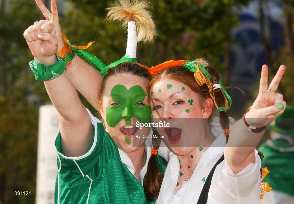 16 June 2002; Republic of Ireland supporters Stacy Gallagher and Nathan O'Hanlon, both from Dublin, outside the stadium prior to the FIFA World Cup 2002 Round of 16 match between Spain and Republic of Ireland at Suwon World Cup Stadium in Suwon, South Korea. Photo by David Maher/Sportsfile