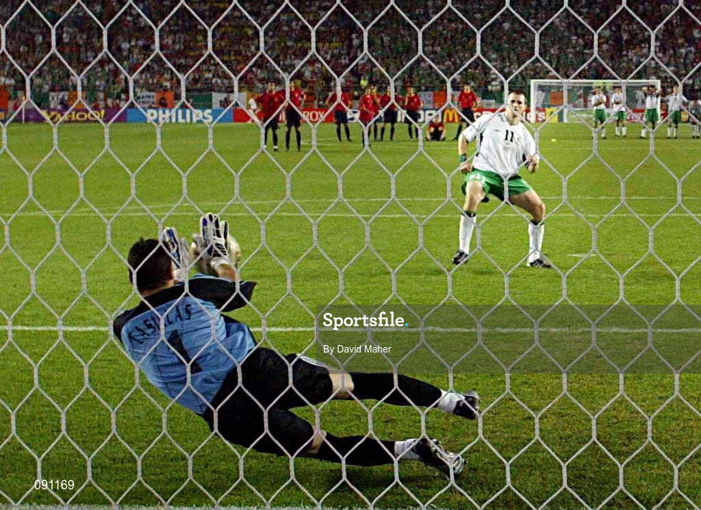 16 June 2002; Kevin Kilbane of Republic of Ireland sees his penalty kick saved by Spain goalkeeper Iker Casillas during the penalty shoot-out of the FIFA World Cup 2002 Round of 16 match between Spain and Republic of Ireland at Suwon World Cup Stadium in Suwon, South Korea. Photo by David Maher/Sportsfile