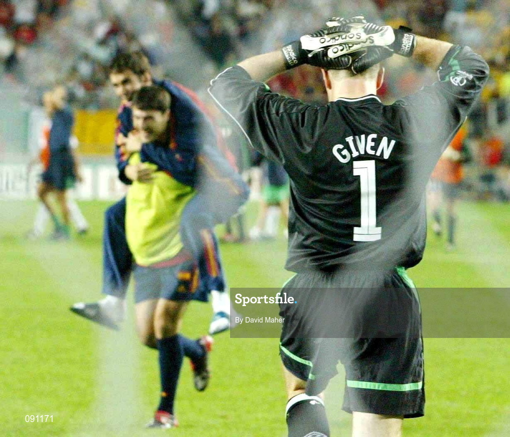 16 June 2002; Republic of Ireland goalkeeper Shay Given holds his head following his side's defeat in a penalty shoot out during their FIFA World Cup 2002 Round of 16 match against Spain at Suwon World Cup Stadium in Suwon, South Korea. Photo by David Maher/Sportsfile