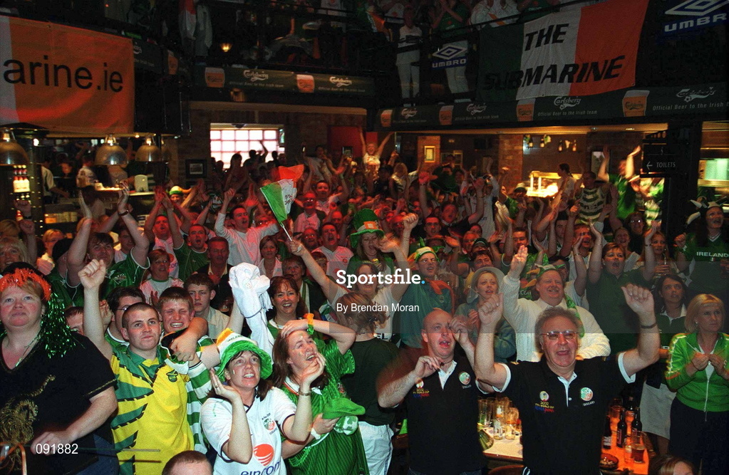 11 June 2002; Republic of Ireland supporters in The Submarine Bar in Crumlin, Dublin, cheer on their side during the FIFA World Cup 2002 Group E match between Saudi Arabia and Republic of Ireland at the International Stadium Yokohama, in Yokohama, Japan. Photo by Brendan Moran/Sportsfile