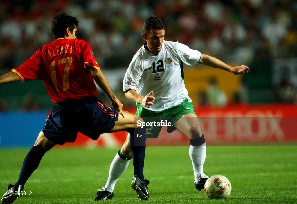 16 June 2002; Mark Kinsella, Republic of Ireland in action against Juan Valeron, Spain, FIFA World Cup Finals, Group E, Republic of Ireland v Spain, Suwon World Cup stadium, Suwon, Korea. Cup2002. Soccer. Picture credit; David Maher / SPORTSFILE *EDI*