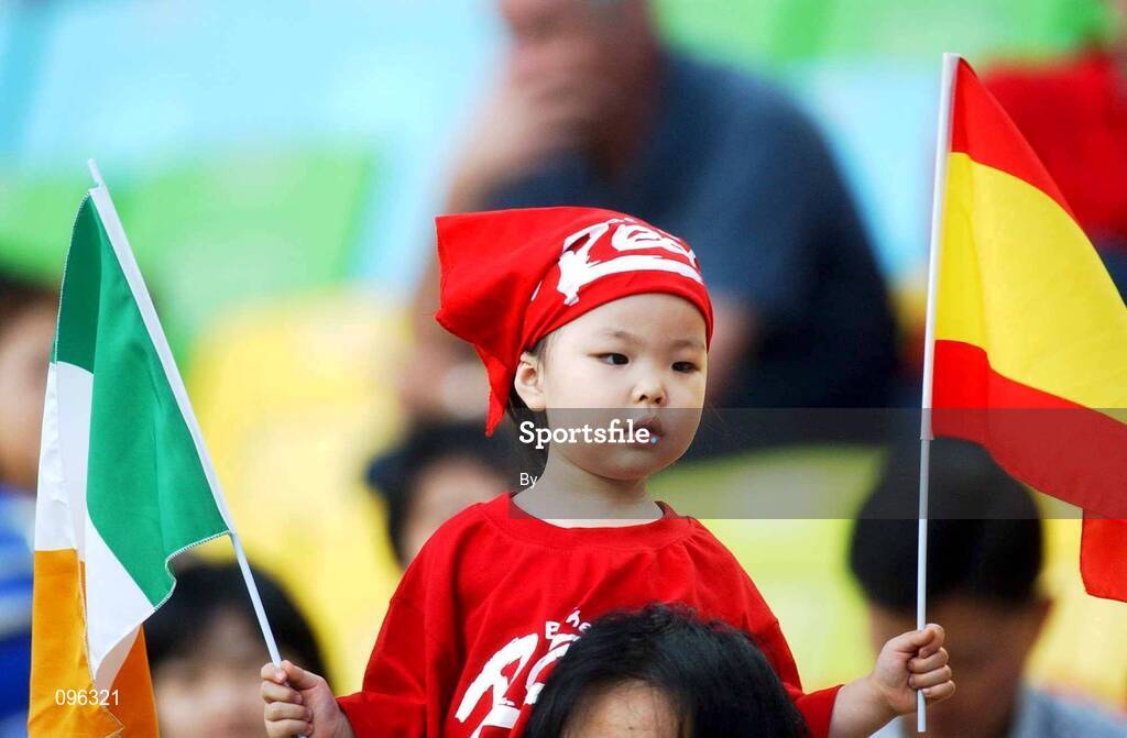 16 June 2002; A young korean fan shows her support for the Republic of Ireland and spainish teams before the start of the game, FIFA World Cup Finals, Group E, Republic of Ireland v Spain, Suwon World Cup stadium, Korea. Cup2002. Soccer. Picture credit; David Maher / SPORTSFILE *EDI*