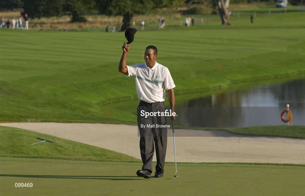 21 September 2002; Tiger Woods waves to the gallery on the 18th green during day three of the WGC-American Express Championship at Mount Juliet Golf Course in Thomastown, Kilkenny. Photo by Matt Browne/Sportsfile
