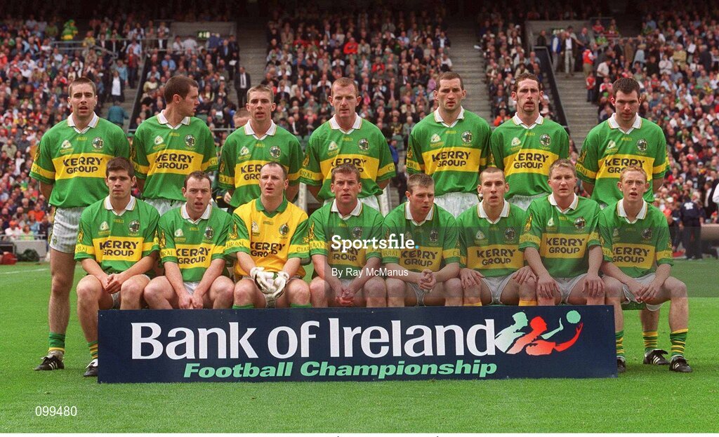22 September 2002; The Kerry team, back row, left to right, Darragh Ó Sé, Eoin Brosnan, Marc Ó Sé, Liam Hassett, Donal Daly, John Sheehan, Michael McCarthy, front row, left to right, Éamonn Fitzmaurice, Séamus Moynihan, Declan O'Keeffe, Dara Ó Cinnéide, Tomás Ó Sé, Seán O'Sullivan, Mike Frank Russell, and Colm Cooper prior to the GAA Football All-Ireland Senior Championship Final match between Armagh and Kerry at Croke Park in Dublin. Photo by Ray McManus/Sportsfile