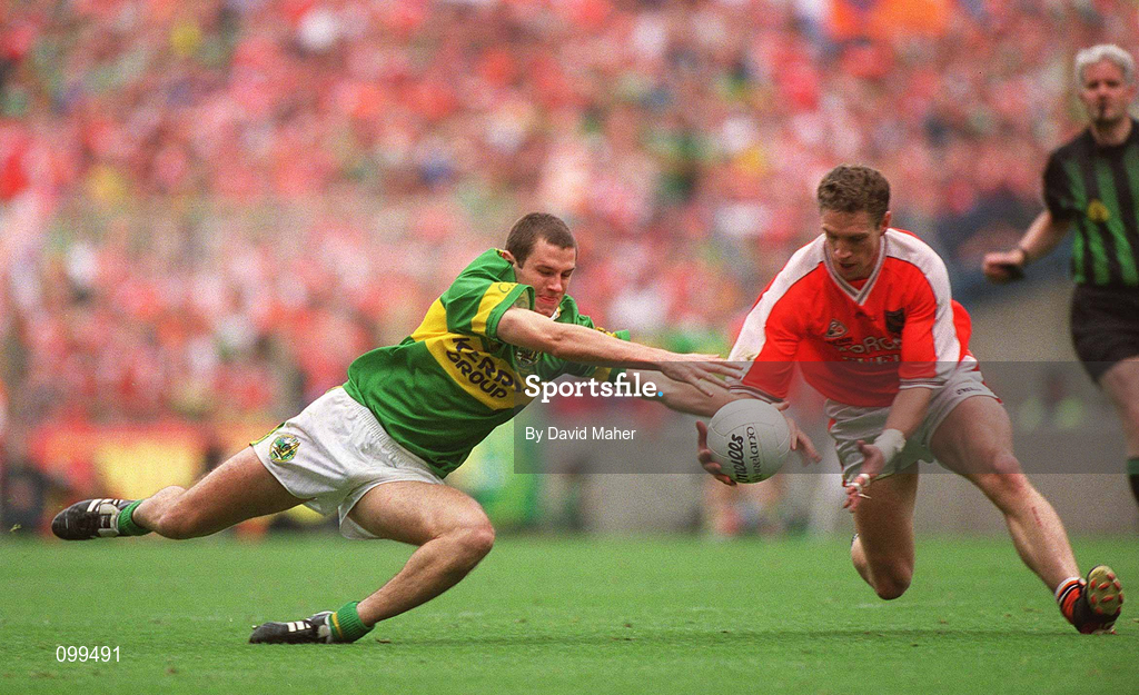 22 September 2002; Eoin Brosnan of Kerry in action against Kieran McGeeney of Armagh during the GAA Football All-Ireland Senior Championship Final match between Armagh and Kerry at Croke Park in Dublin. Photo by David Maher/Sportsfile