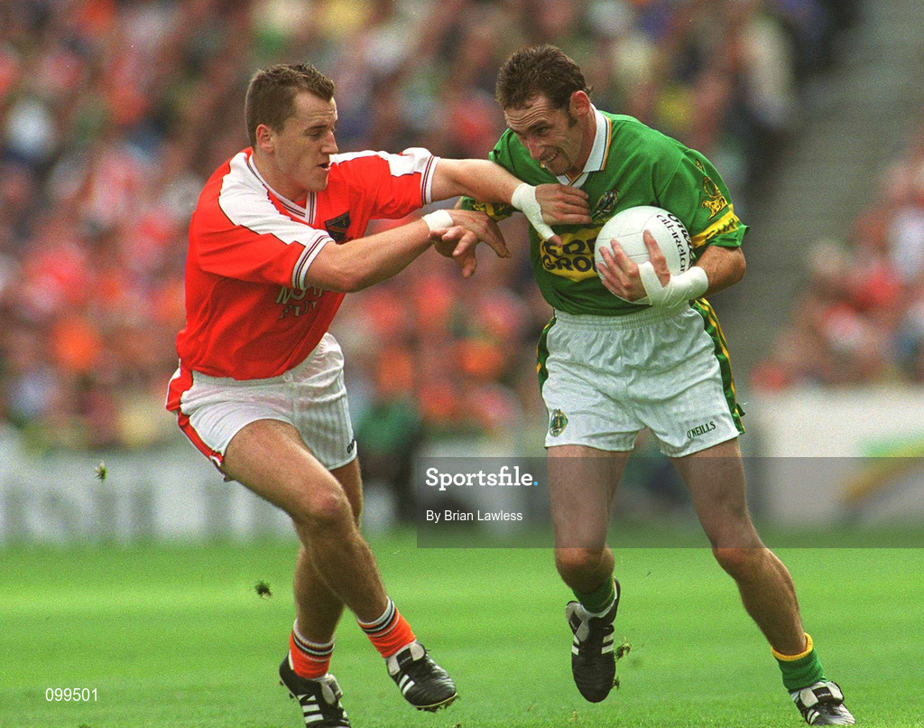 22 September 2002; John Sheehan of Kerry in action against Paddy McKeever of Armagh during the GAA Football All-Ireland Senior Championship Final match between Armagh and Kerry at Croke Park in Dublin. Photo by Brian Lawless/Sportsfile