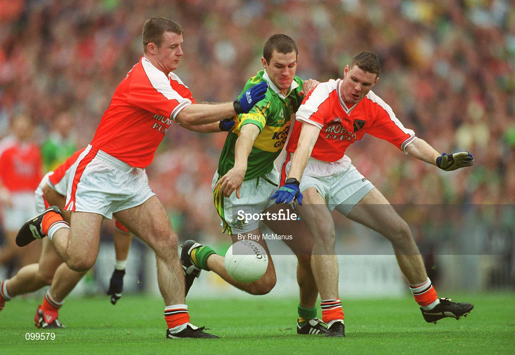 22 September 2002; Eoin Brosnan of Kerry is challenged by Justin McNulty, left, and John Toal of Armagh during the GAA Football All-Ireland Senior Championship Final match between Armagh and Kerry at Croke Park in Dublin. Photo by Ray McManus/Sportsfile