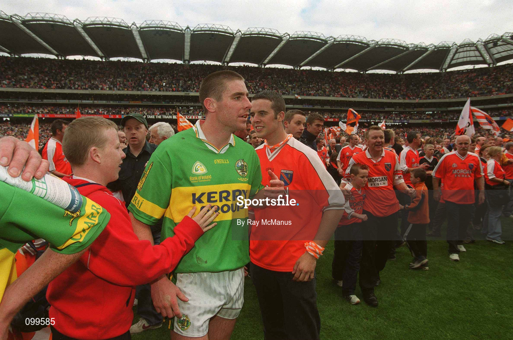 22 September 2002; Darragh O Se of Kerry makes his way off the field through Armagh supporters following his side's defeat in the GAA Football All-Ireland Senior Championship Final match between Armagh and Kerry at Croke Park in Dublin. Photo by Ray McManus/Sportsfile
