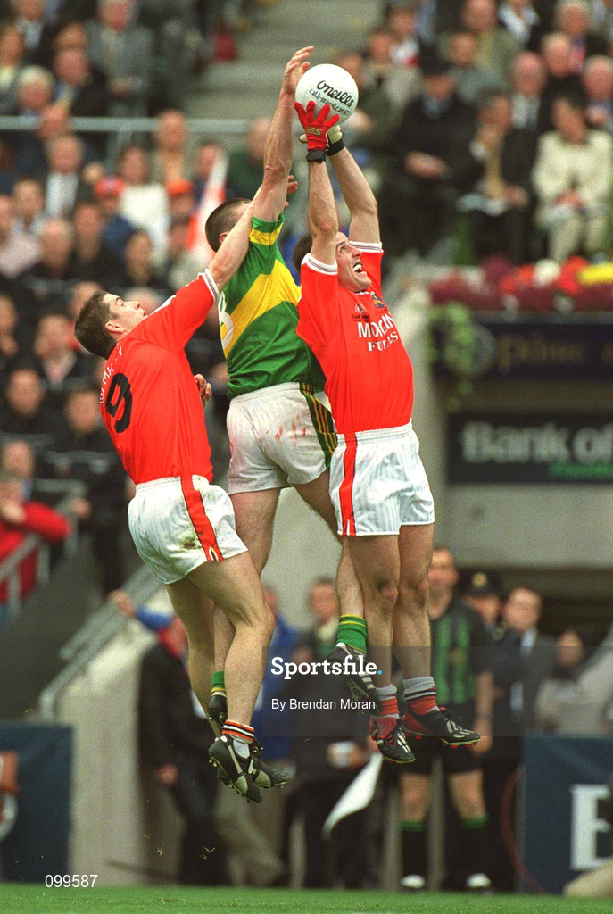 22 September 2002; Darragh O Se of Kerry in action against Paul McGrane, left, and Barry O'Hagan of Armagh during the GAA Football All-Ireland Senior Championship Final match between Armagh and Kerry at Croke Park in Dublin. Photo by Brendan Moran/Sportsfile