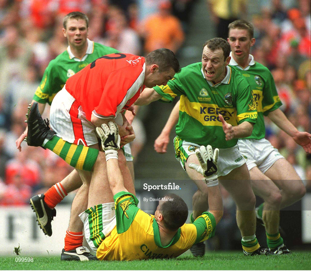 22 September 2002; Oisin McConville of Armagh is tackled by Kerry goalkeeper Declan O'Keeffe and Seamus Moynihan which led to an Armagh penalty during the GAA Football All-Ireland Senior Championship Final match between Armagh and Kerry at Croke Park in Dublin. Photo by David Maher/Sportsfile