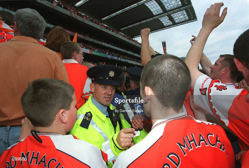 22 September 2002; A member of the Garda Siochana attempts to control the supporters who came onto the pitch after the GAA Football All-Ireland Senior Championship Final match between Armagh and Kerry at Croke Park in Dublin. Photo by Damien Eagers/Sportsfile