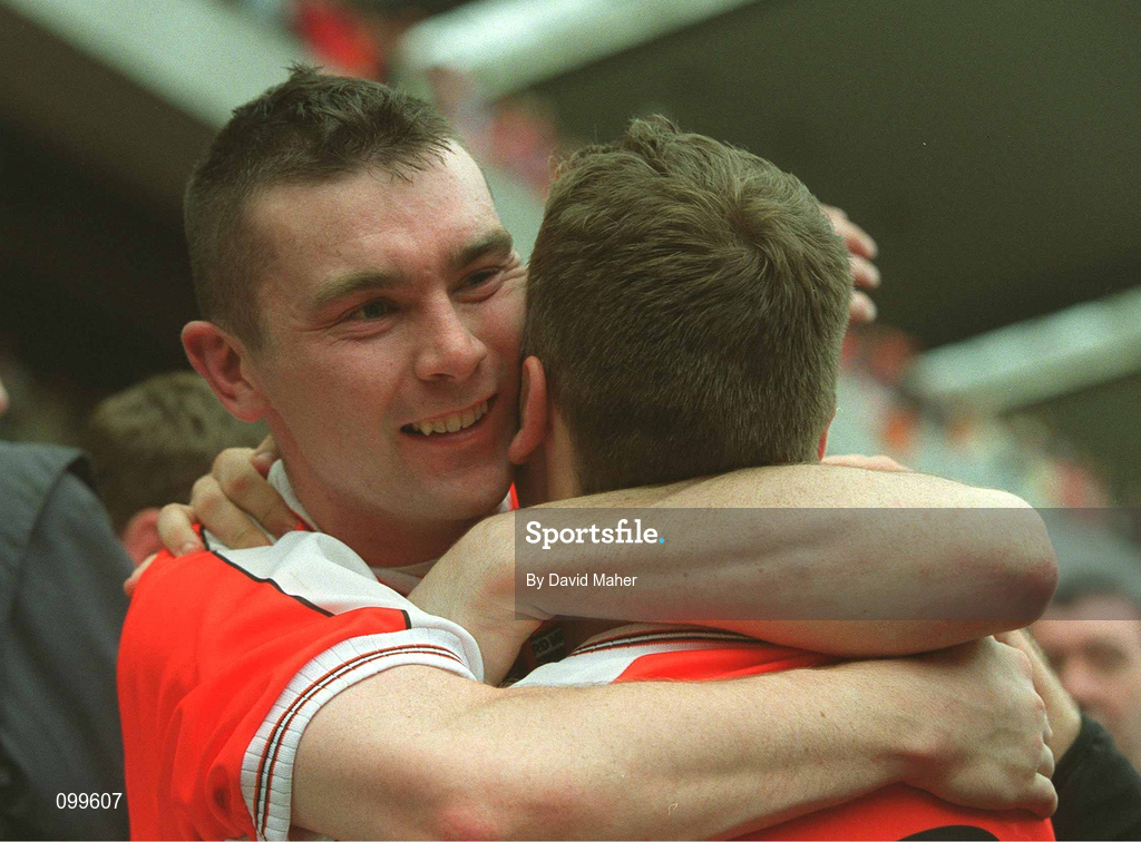 22 September 2002; Oisin McConville, left, celebrates with Armagh team-mate John Toal following the GAA Football All-Ireland Senior Championship Final match between Armagh and Kerry at Croke Park in Dublin. Photo by David Maher/Sportsfile