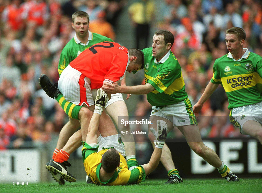 22 September 2002; Oisin McConville of Armagh is tackled by Kerry goalkeeper Declan O'Keeffe and Seamus Moynihan which led to an Armagh penalty during the GAA Football All-Ireland Senior Championship Final match between Armagh and Kerry at Croke Park in Dublin. Photo by David Maher/Sportsfile