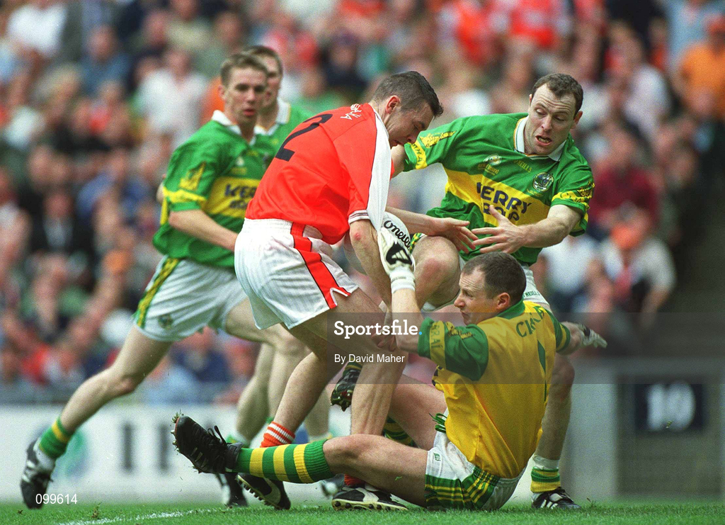 22 September 2002; Oisin McConville of Armagh is tackled by Kerry goalkeeper Declan O'Keeffe and Seamus Moynihan which led to an Armagh penalty during the GAA Football All-Ireland Senior Championship Final match between Armagh and Kerry at Croke Park in Dublin. Photo by David Maher/Sportsfile