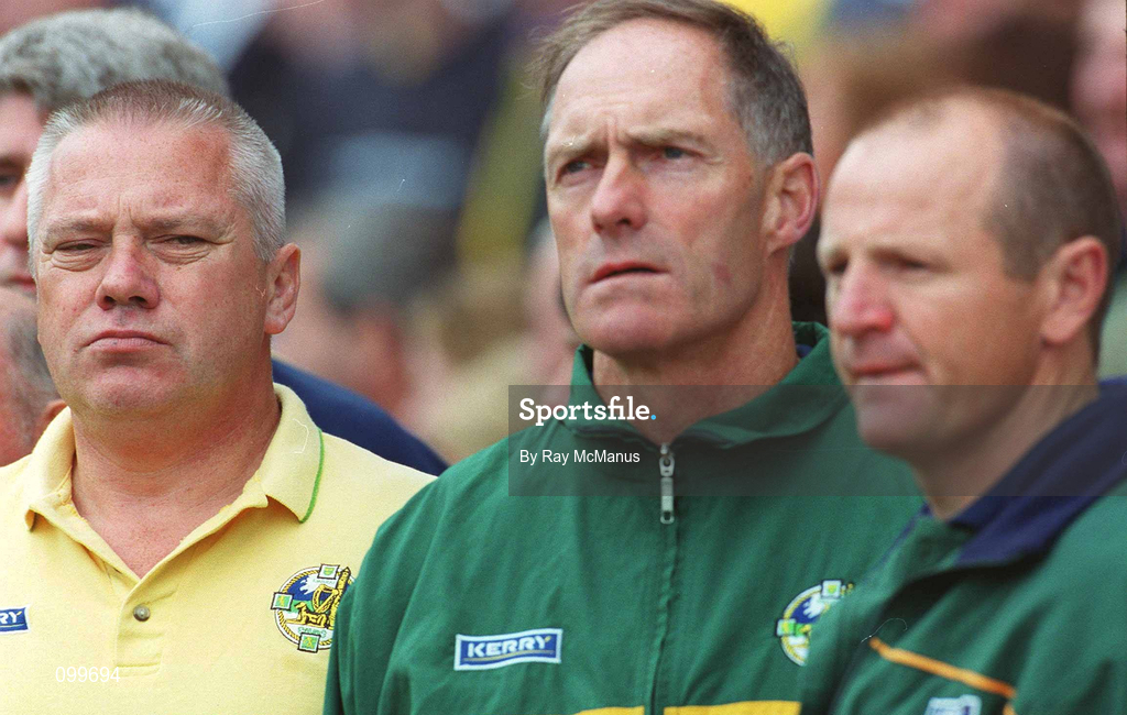 22 September 2002; Kerry manager Paidi O Se, left, stands for the National Anthem with team trainer John O'Keeffe and selector Eamon Walsh prior to the GAA Football All-Ireland Senior Championship Final match between Armagh and Kerry at Croke Park in Dublin. Photo by Ray McManus/Sportsfile