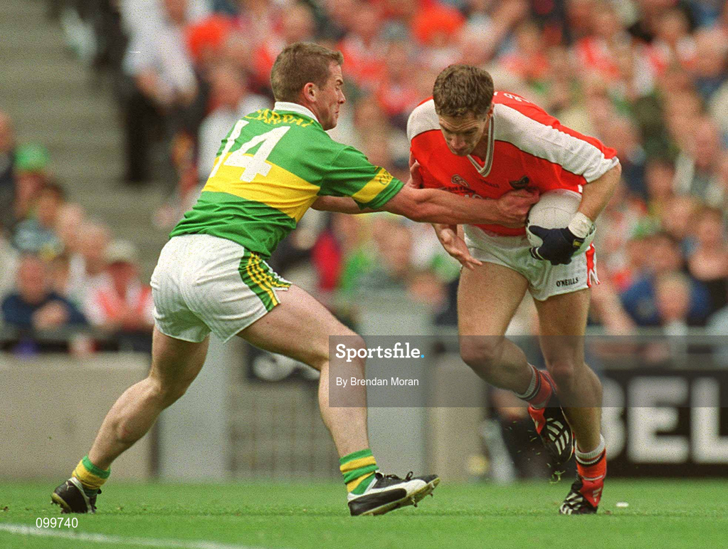 22 September 2002; Kieran McGeeney of Armagh in action against Dara Ó Cinnéide of Kerry during the GAA Football All-Ireland Senior Championship Final match between Armagh and Kerry at Croke Park in Dublin. Photo by Brendan Moran/Sportsfile