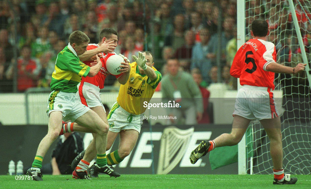 22 September 2002; Diarmuid Marsden of Armagh is tackled by Kerry goalkeeper Declan O'Keeffe and Marc O Se during the GAA Football All-Ireland Senior Championship Final match between Armagh and Kerry at Croke Park in Dublin. Photo by Ray McManus/Sportsfile