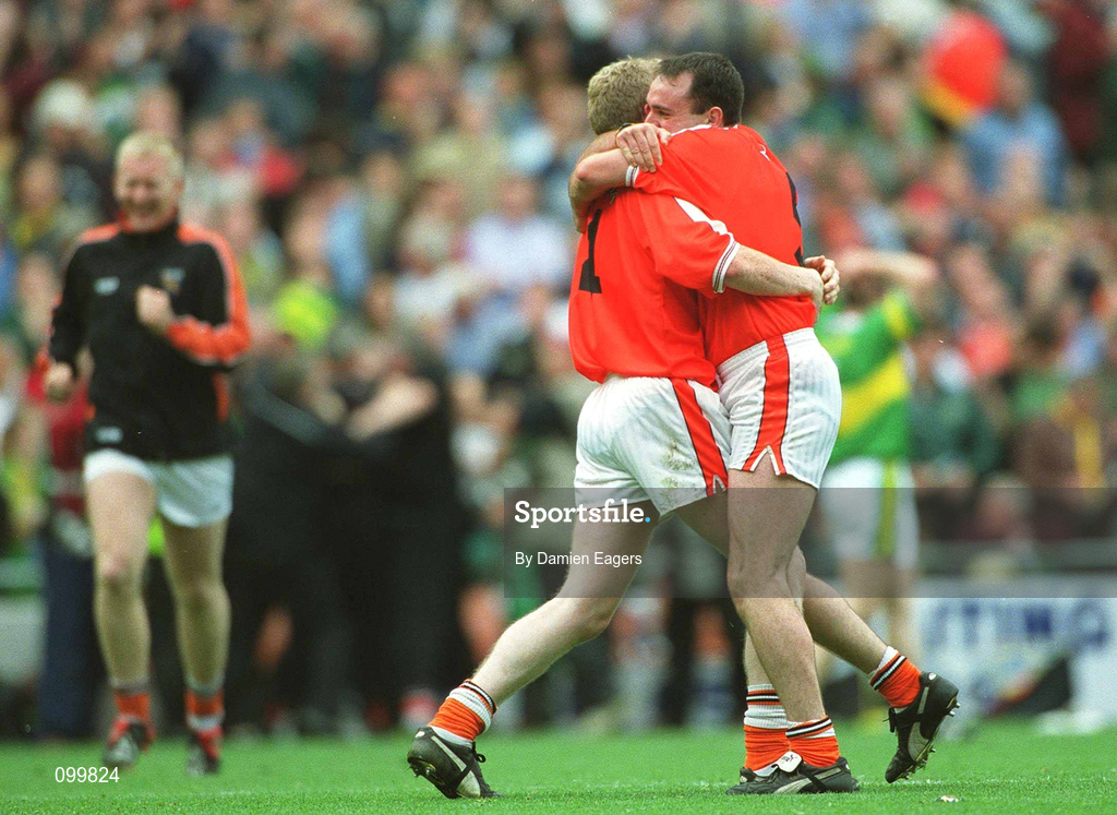 22 September 2002; Francis Bellew, left, and Aiden O'Rourke of Armagh following the GAA Football All-Ireland Senior Championship Final match between Armagh and Kerry at Croke Park in Dublin. Photo by Damien Eagers/Sportsfile